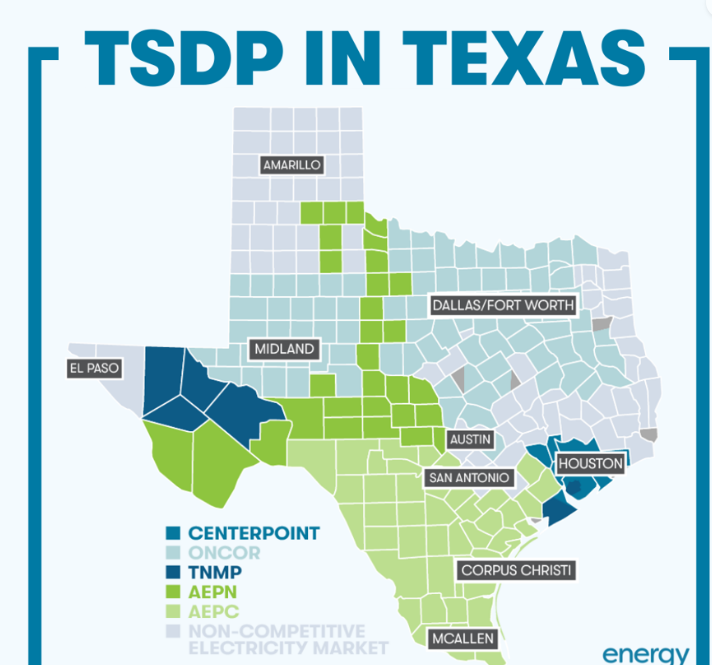 The Transmission and Distribution Service Provider (TDSP) is responsible for maintenance and service of the wires and poles that transmit electricity. If the customer is experiencing a power outage, this is to be reported to the TDSP.